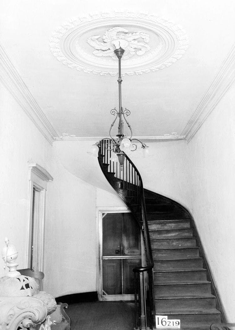 6. Historic American Buildings Survey Alex Bush, Photographer, December 26, 1934. VIEW OF STAIR HALL. (Entrance hall with stair and plaster ceiling medallion) - Magnolia Grove, 1002 Hobson Street, Greensboro, Hale County, AL