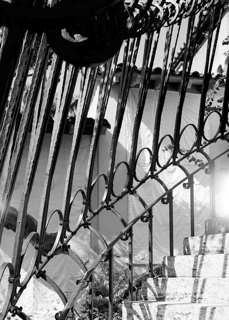 80. April 1967 DETAIL OF IRON STAIR ENCLOSURE TO PINE HALL ON NORTHWEST SIDE OF OWNER'S WING - Mar-a-Lago, 1100 South Ocean Boulevard, Palm Beach, Palm Beach County, FL