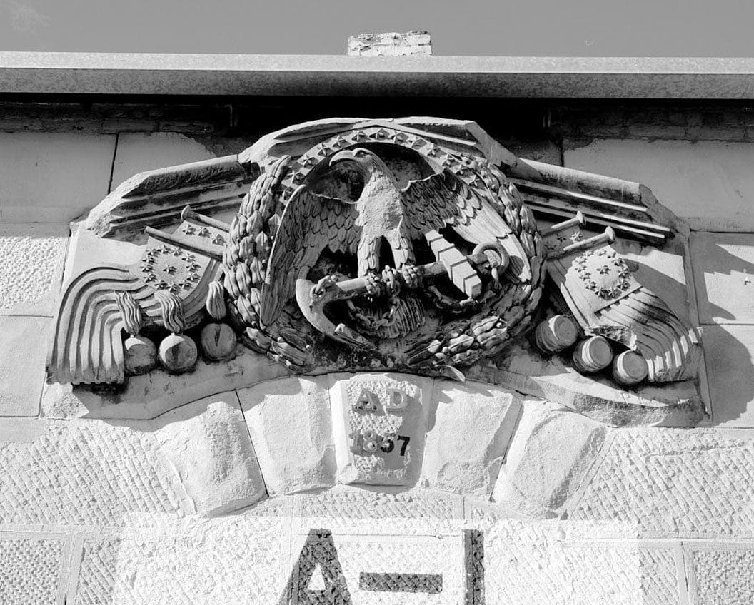 Detail of carving above doors on east elevation; camera facing west. - Mare Island Naval Shipyard, Magazine No. 1, Railroad Avenue, west side near Maseda Road, Vallejo, Solano County, CA