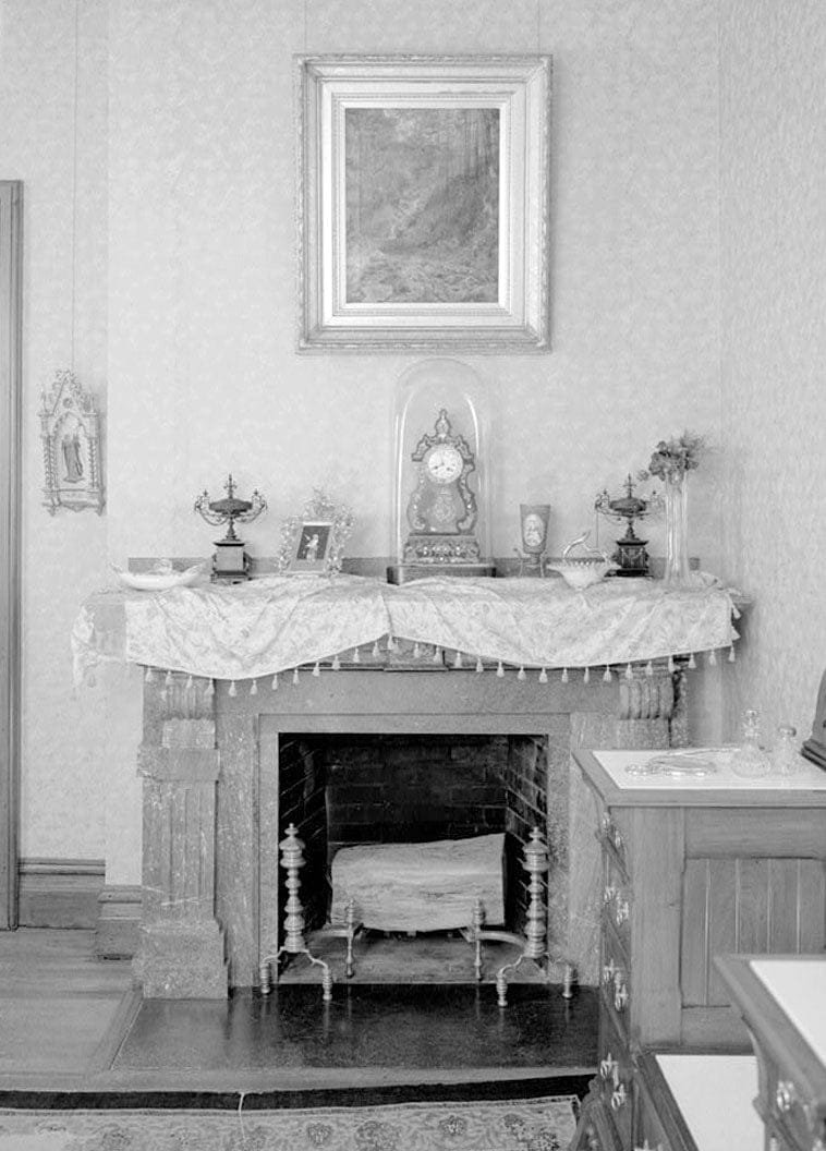 71. INTERIOR, FIRST FLOOR, MAHOGANY GUEST ROOM, DETAIL OF FIREPLACE AND MANTLE IN NORTHWEST CORNER FROM THE EAST - Mark Twain House, 351 Farmington Avenue (corrected from original address of 531 Farmington Avenue), Hartford, Hartford County, CT