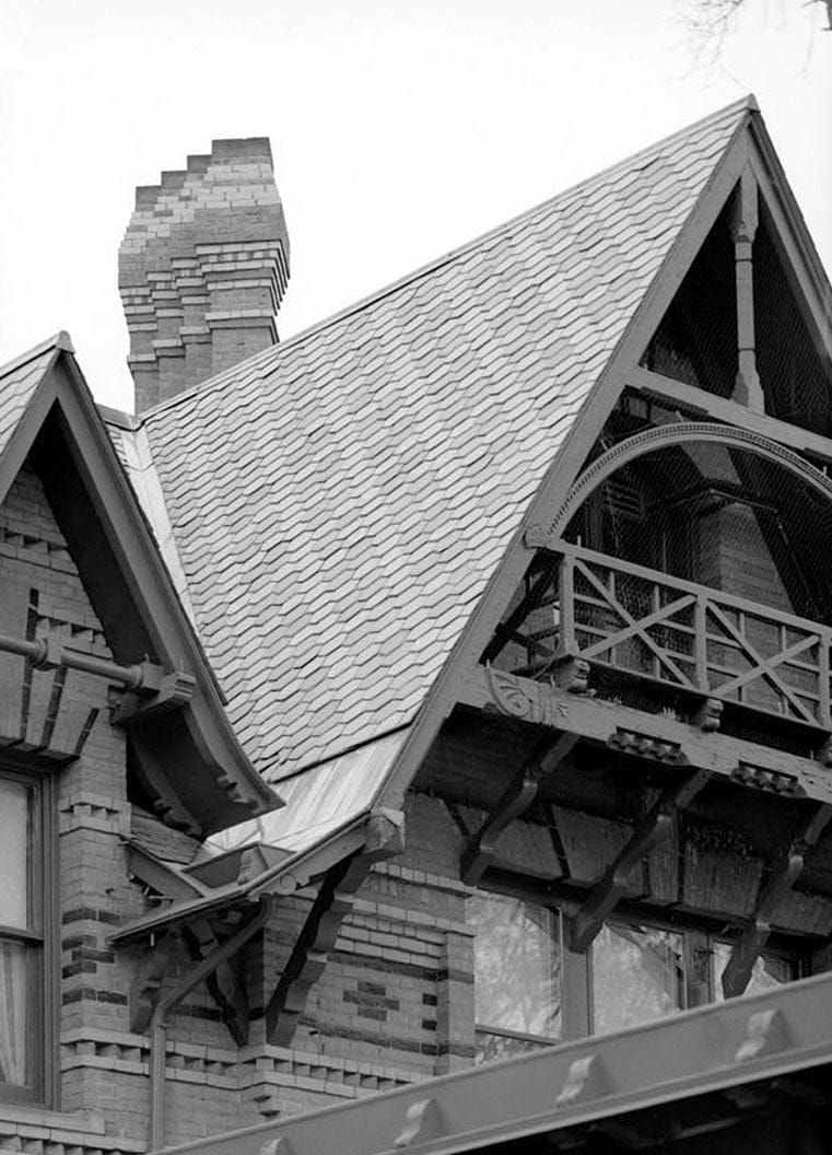36. EXTERIOR, DETAIL VIEW OF GABLE WITH CHIMNEY IN BACKGROUND FROM THE SOUTHEAST - Mark Twain House, 351 Farmington Avenue (corrected from original address of 531 Farmington Avenue), Hartford, Hartford County, CT