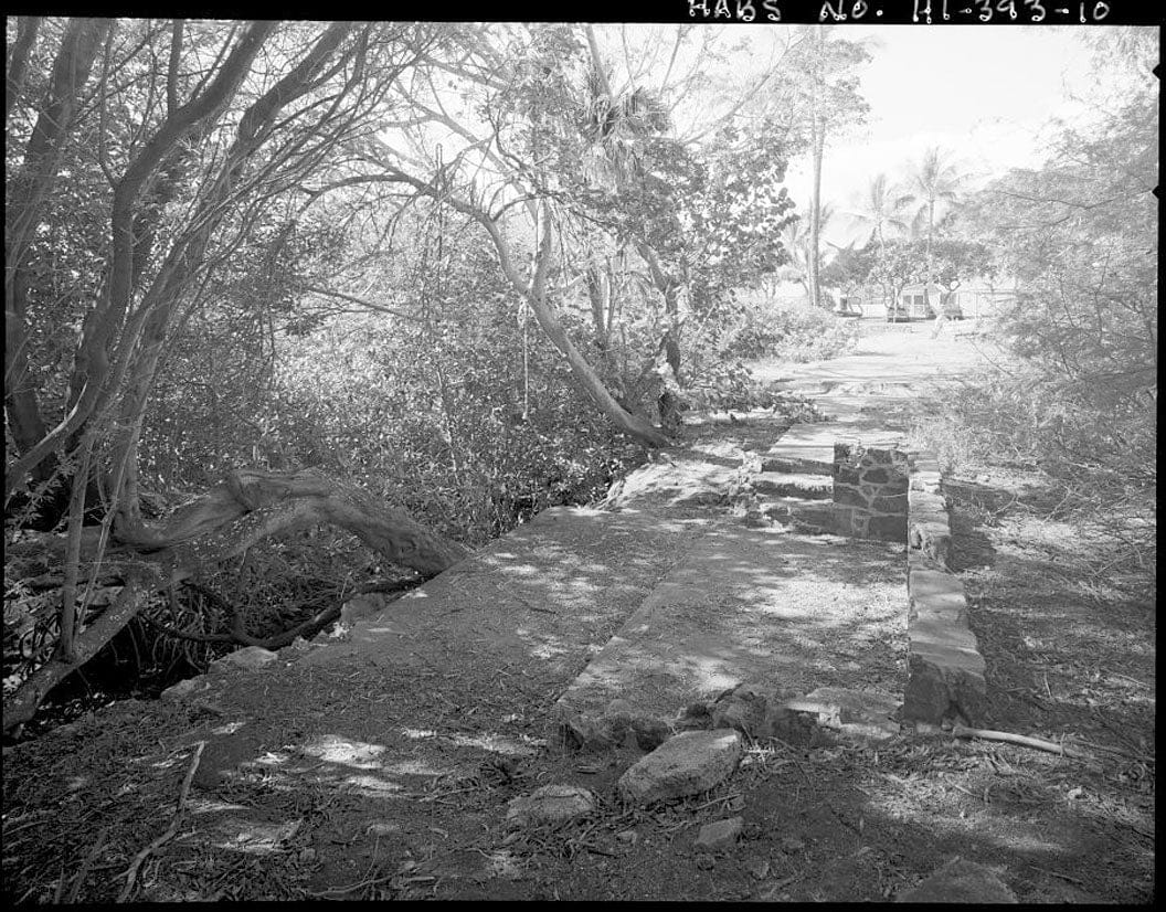 Pan American Airways/Naval Air Transport Service/destroyer base site at the east side showing walkway and building foundation. View facing west-northwest. - U.S. Naval Base, Pearl Harbor, Pearl City Peninsula, Pearl City, Honolulu County, HI