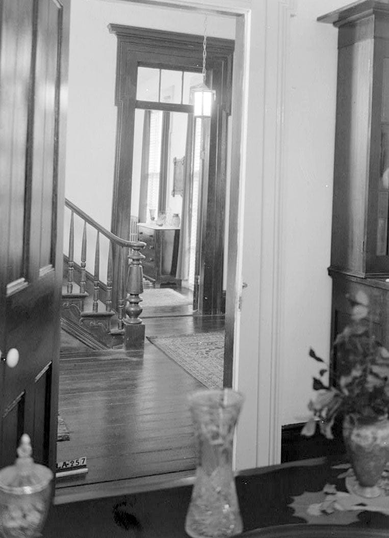 8. Historic American Buildings Survey Alex Bush, Photographer, December 11, 1936 VIEW THROUGH LIVING ROOM DOOR ACROSS HALL INTO GUEST ROOM SHOWING BASE OF STAIR IN HALL - Oak Manor, State Road 28, Livingston, Sumter County, AL