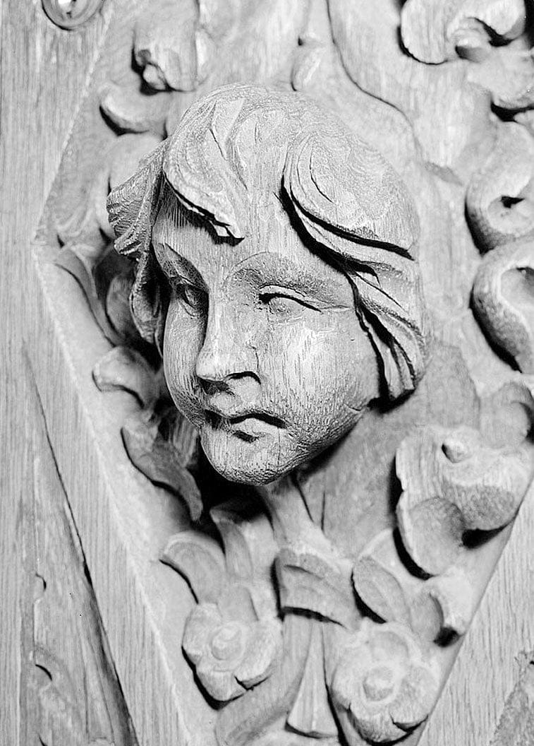 12. BAPTISMAL FONT, DETAIL OF CARVED CHERUB - Our Lady of the Wayside Roman Catholic Church, 930 Portola Road, Portola Valley, San Mateo County, CA