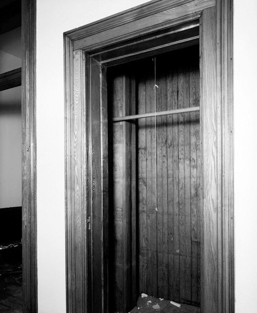 View northeast, detail of laundry dumbwaiter, remodeled as a closet - St. Peter's Convent, 88 Main Street, Danbury, Fairfield County, CT
