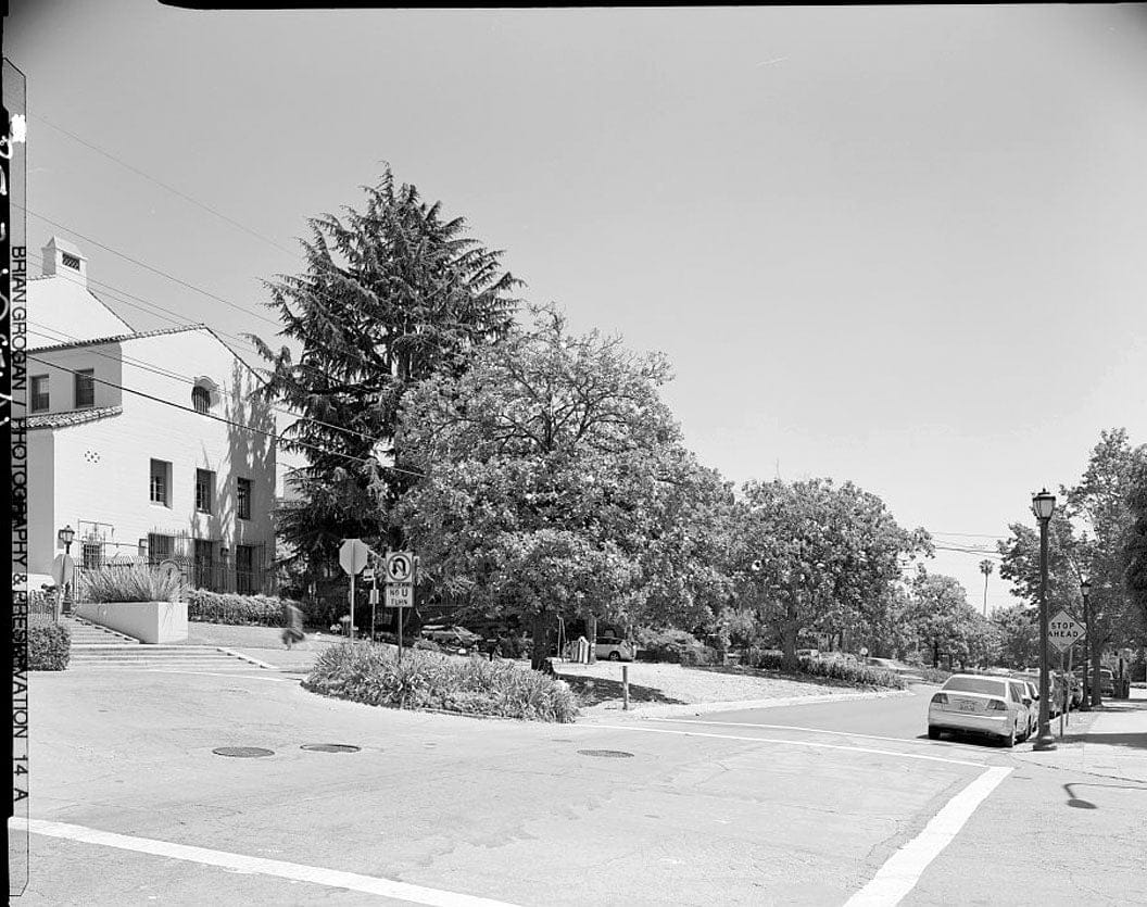 VIEW OF PIEDMONT AVENUE AT BANCROFT WAY. SEEN FROM WEST SIDE OF PIEDMONT LOOKING SE. INTERNATIONAL HOUSE ON THE NORTHEAST SIDE AT 2299 PIEDMONT BY GEORGE W. KELHAM, 1929. Photograph by Brian Grogan, July 8, 2007 - Piedmont Way & the Berkeley Property Tract, East of College Avenue between Dwight Way & U.C. Memorial Stadium, Berkeley, Alameda County, CA