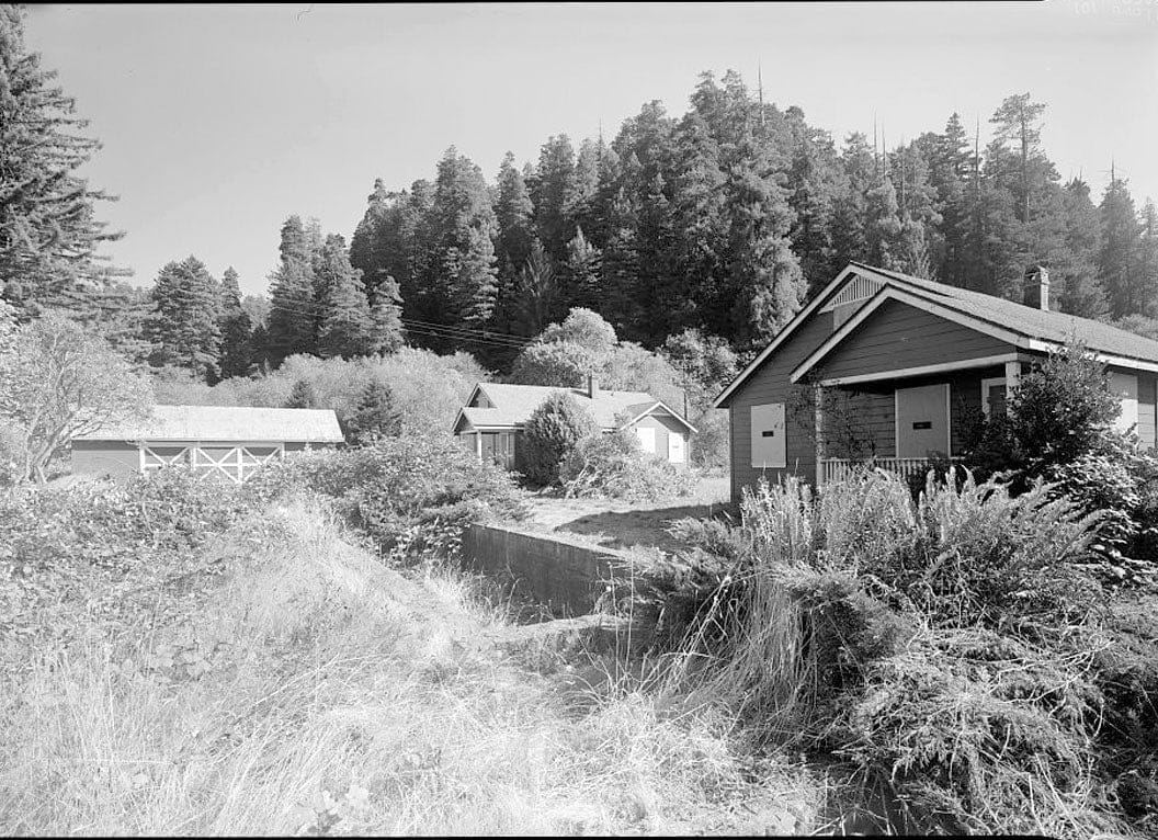 Superintendent and assistant superintendent's quarters with the tank in the foreground. View to the southeast. - Prairie Creek Fish Hatchery, Hwy. 101, Orick, Humboldt County, CA