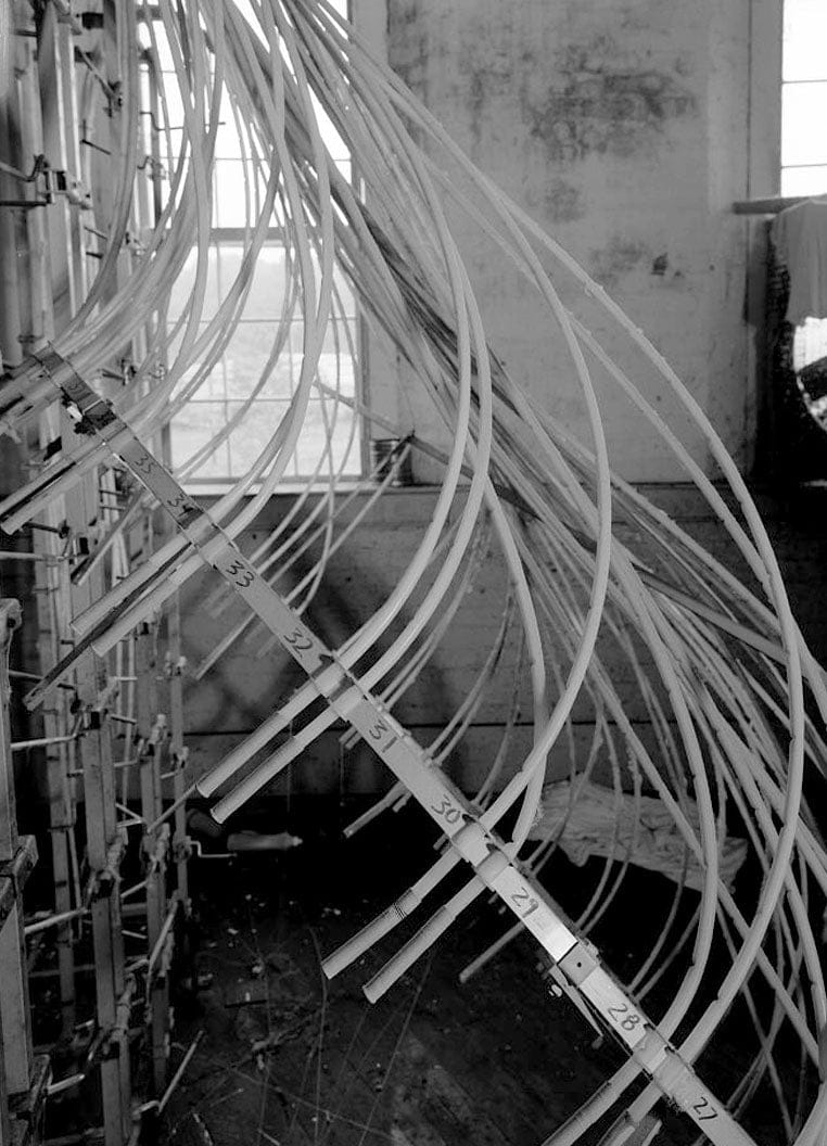 38. DETAIL OF CREEL MACHINE, MILL NO. 2, 2nd FLOOR; NOTE THREAD NUMBERS. - Prattville Manufacturing Company, Number One, 242 South Court Street, Prattville, Autauga County, AL