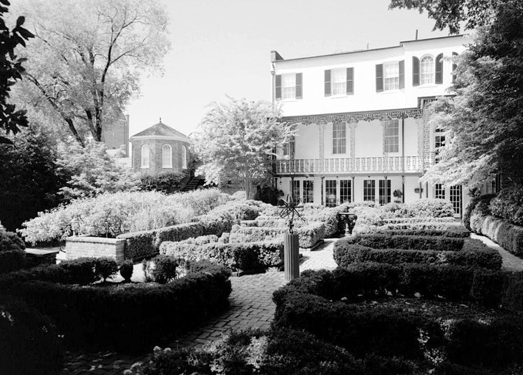 Garden view looking west across terrace to south end of the west elevation & gazebo - Prospect House, 3508 Prospect Street, Northwest, Washington, District of Columbia, DC