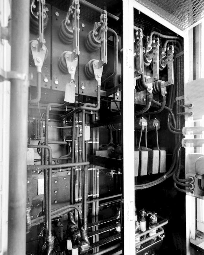 25. VIEW, LOOKING SOUTHWEST INSIDE TRANSFORMER ROOM, SHOWING TRANSFORMERS AND KNIFE SWITCHES - Sacramento River Bridge, Spanning Sacramento River at California State Highway 275, Sacramento, Sacramento County, CA