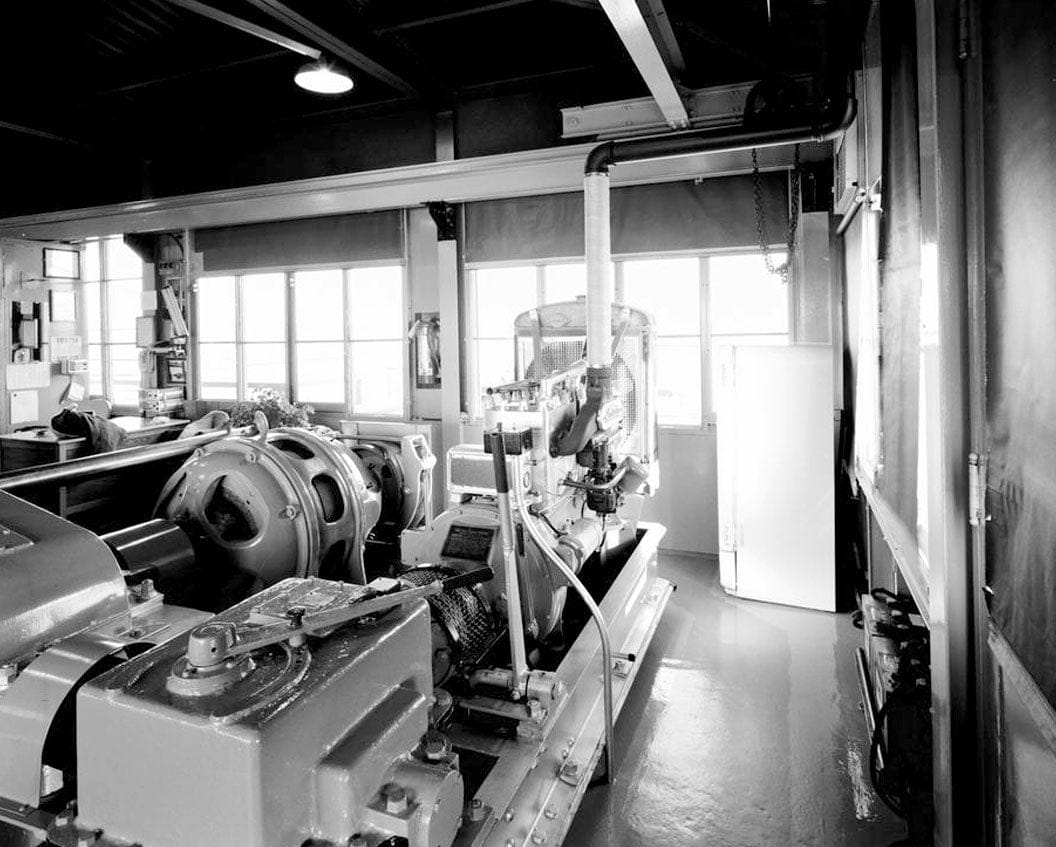 24. VIEW, LOOKING NORTHEAST, SHOWING MAIN TRANSMISSION IN LEFT FOREGROUND, GASOLINE-POWERED WAUKESHA AUXILIARY DRIVE MOTOR AT CENTER, AND ONE OF TWO MAIN ELECTRIC DRIVE MOTORS AT LEFT CENTER - Sacramento River Bridge, Spanning Sacramento River at California State Highway 275, Sacramento, Sacramento County, CA