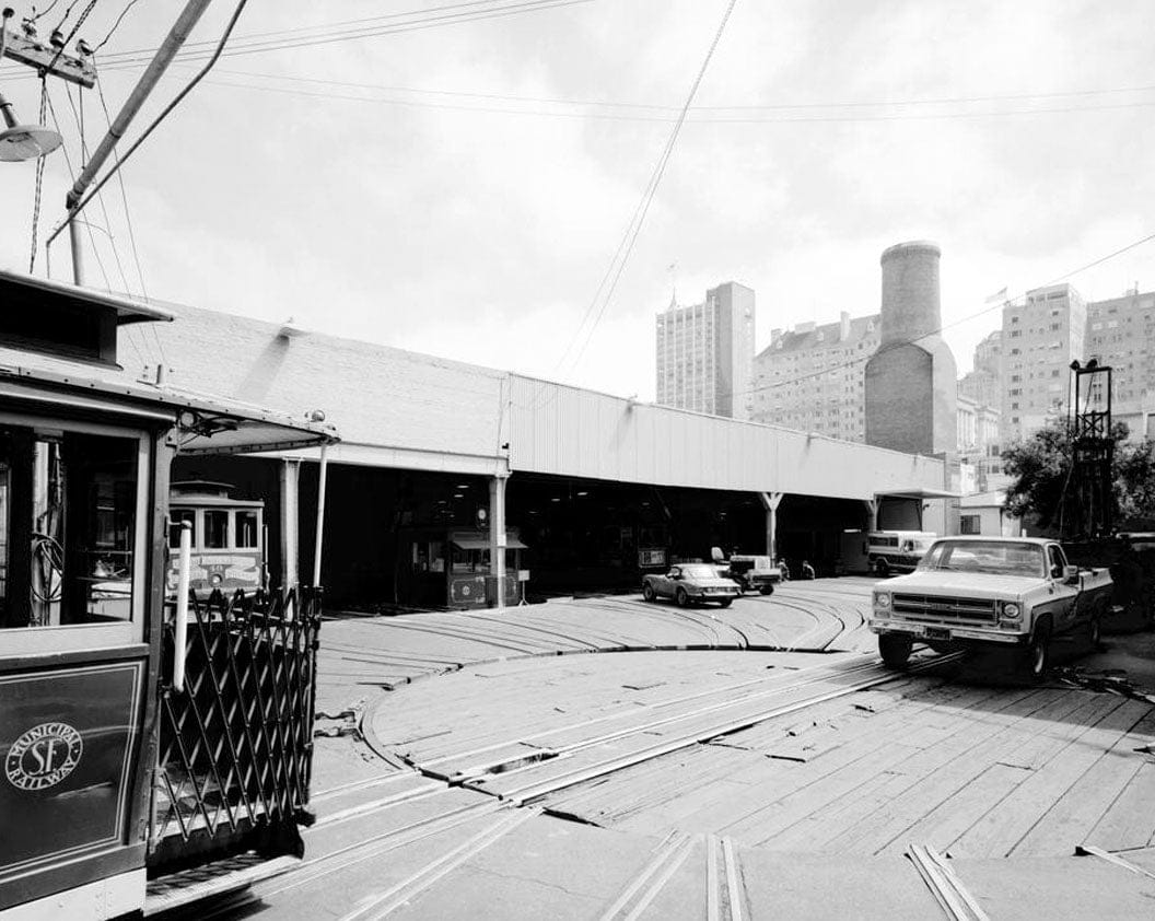 37. WEST REAR OF POWERHOUSE AND CAR BARN: West rear of powerhouse and car barn, showing the turntable and tracks used to move cars in and out of the building's repair and storage area. - San Francisco Cable Railway, Washington & Mason Streets, San Francisco, San Francisco County, CA
