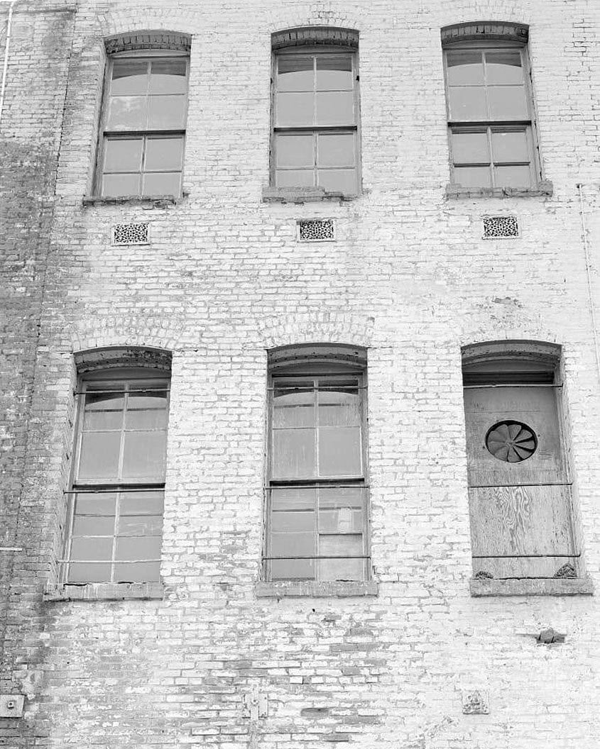 Exterior building details of Building C, west façade: second floor: four-over-four windows, arch brick lintels, brick sills, decorative metal grilles; easterly view - San Quentin State Prison, Building 22, Point San Quentin, San Quentin, Marin County, CA