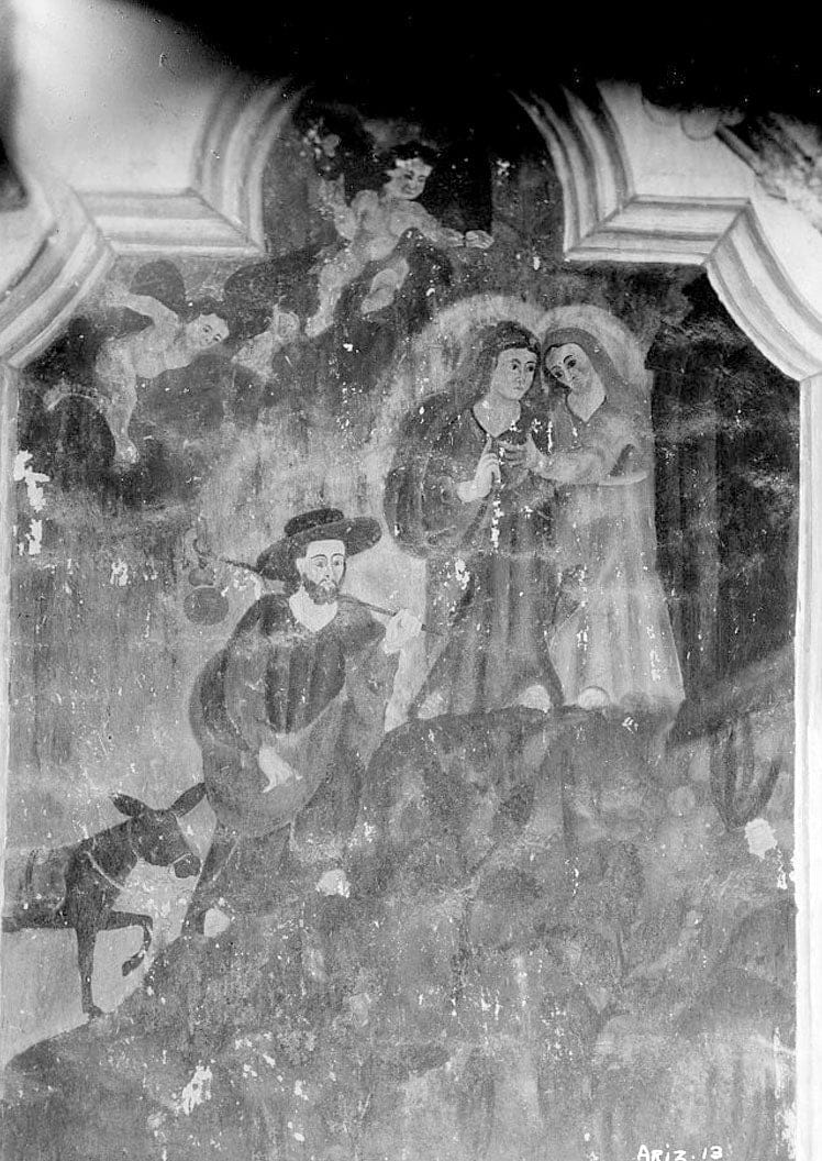 103. Historic American Buildings Survey, Donald W. Dickensheets, Photographer. April 23, 1940. CHANCEL MURAL - 'THE VISITATION'. (WEST ELEVATION). - San Xavier del Bac Mission, Mission Road, Tucson, Pima County, AZ