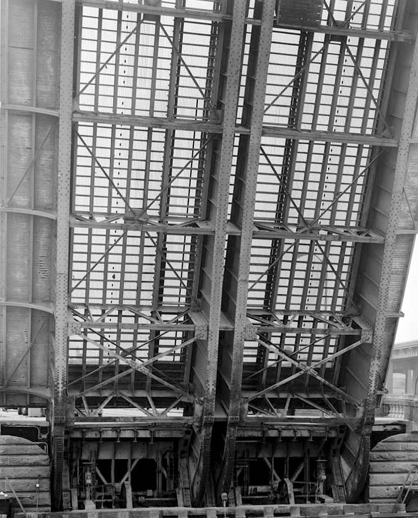 25. VIEW WEST SHOWING BASCULE GIRDERS 'A', 'B', 'C', AND 'D'; DRIVE GEAR 'D' WITH GUARD IS LOCATED IN THE LOWER CENTER OF THE PHOTOGRAPH. REFER TO GEARING DIAGRAMS - STRAUSS SHEET #15 FOR POWER TRAIN RELATIONSHIPS. - Tomlinson Bridge, Spanning Quinnipiac River at Forbes Street (U.S. Route 1), New Haven, New Haven County, CT