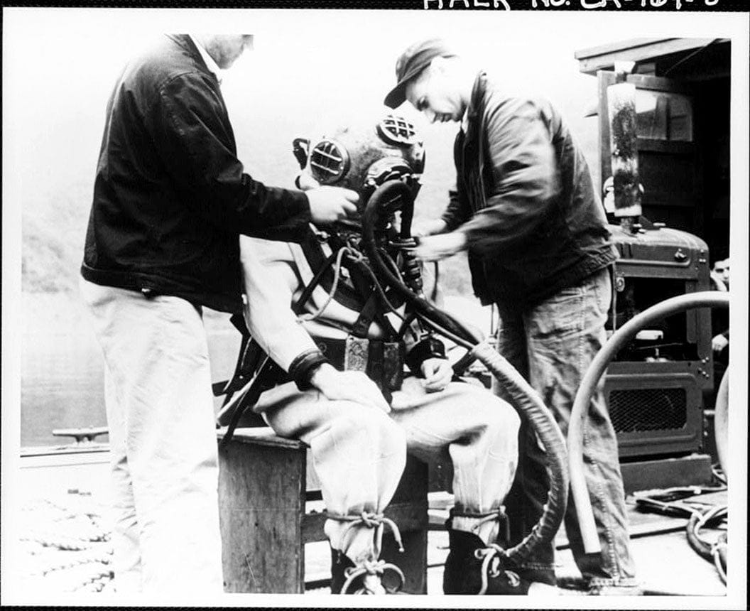 8. DIVER BEING PREPARED FOR A DIVE ON MORRIS RESERVOIR, Date unknown. - Variable Angle Launcher Complex, CA State Highway 39 at Morris Reservior, Azusa, Los Angeles County, CA