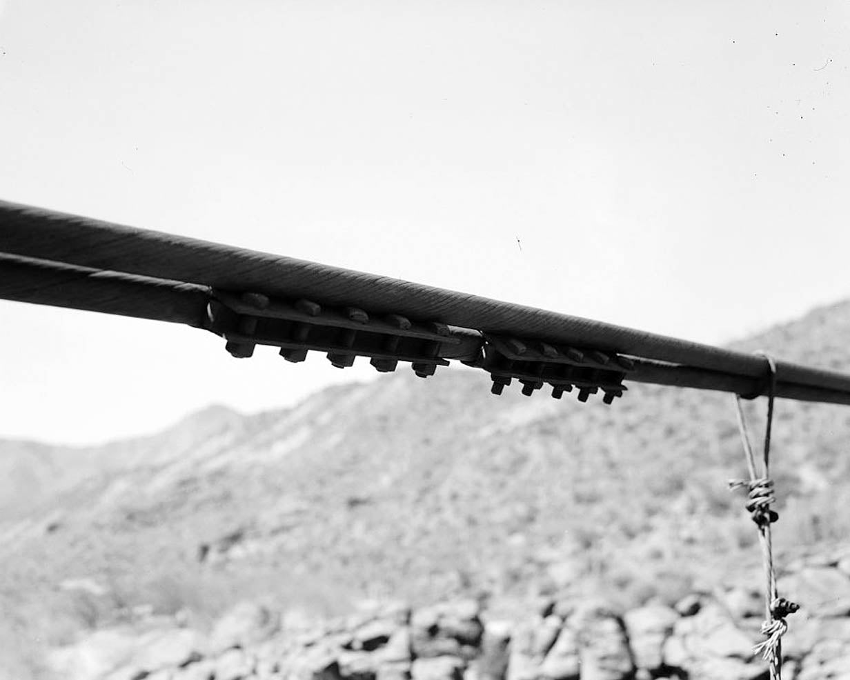 22. DETAIL VIEW OF TRESTLE SADDLE CLIP ATTACHED TO MAIN SUSPENSION CABLE. THE CLIP REMAINS FROM THE ERA OF TRAMWAY SERVICE. March 1987 - Verde River Sheep Bridge, Spanning Verde River (Tonto National Forest), Cave Creek, Maricopa County, AZ
