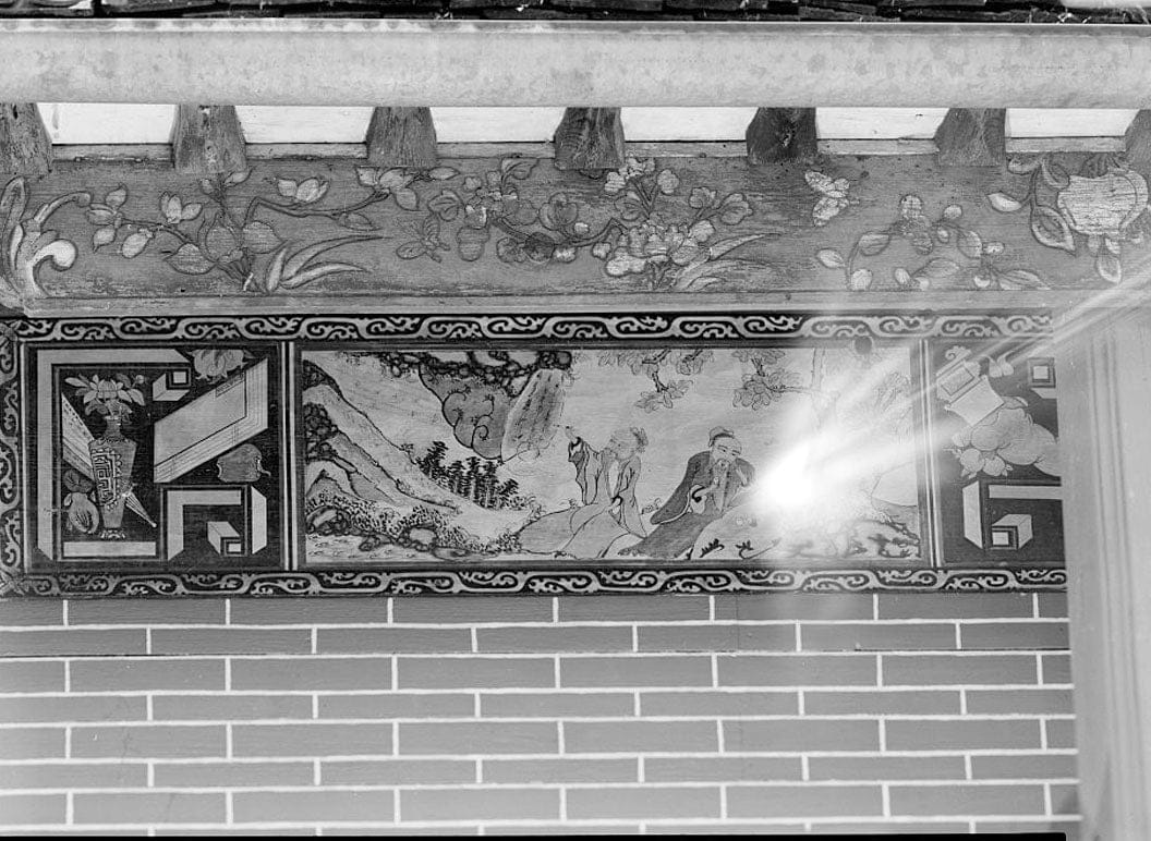 Detail of painted frieze at top of porch south wall - Weaverville Joss House, Oregon Street, Weaverville, Trinity County, CA