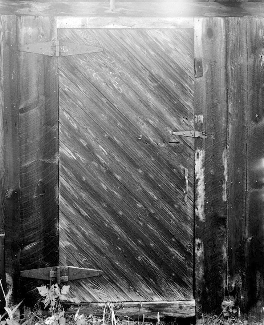 16. STORAGE SHED DOOR DETAIL, SOUTH FRONT. - Hondius Water Line, 1.6 miles Northwest of Park headquarters building & 1 mile Northwest of Beaver Meadows entrance station, Estes Park, Larimer County, CO