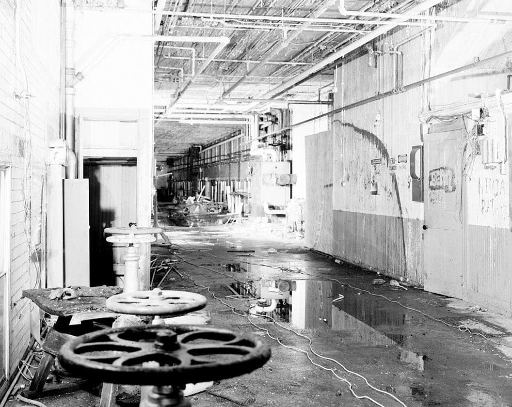 16. View west from center of central corridor between filtration beds which are located to the left and right of the photograph. - Lake Whitney Water Filtration Plant, Filtration Plant, South side of Armory Street between Edgehill Road & Whitney Avenue, Hamden, New Haven County, CT
