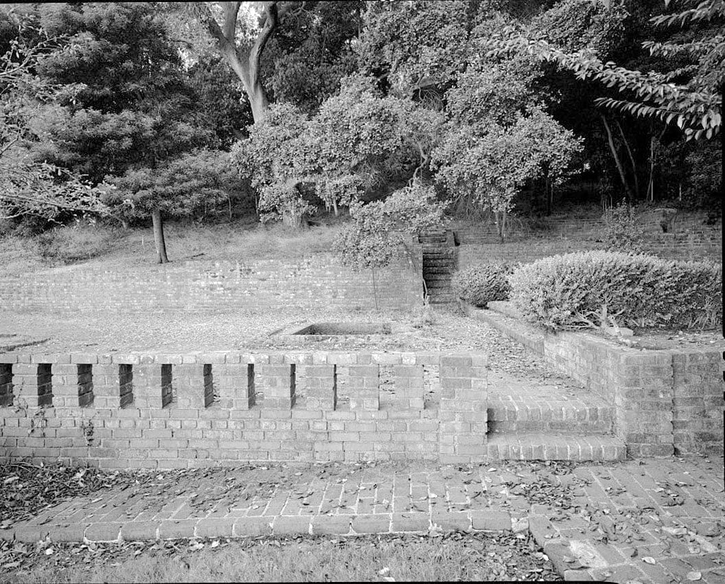 View of main terrace showing rear fountain, taken from the north side, camera facing south - Naval Training Station, Senior Officers' Quarters District, Naval Station Treasure Island, Yerba Buena Island, San Francisco, San Francisco County, CA