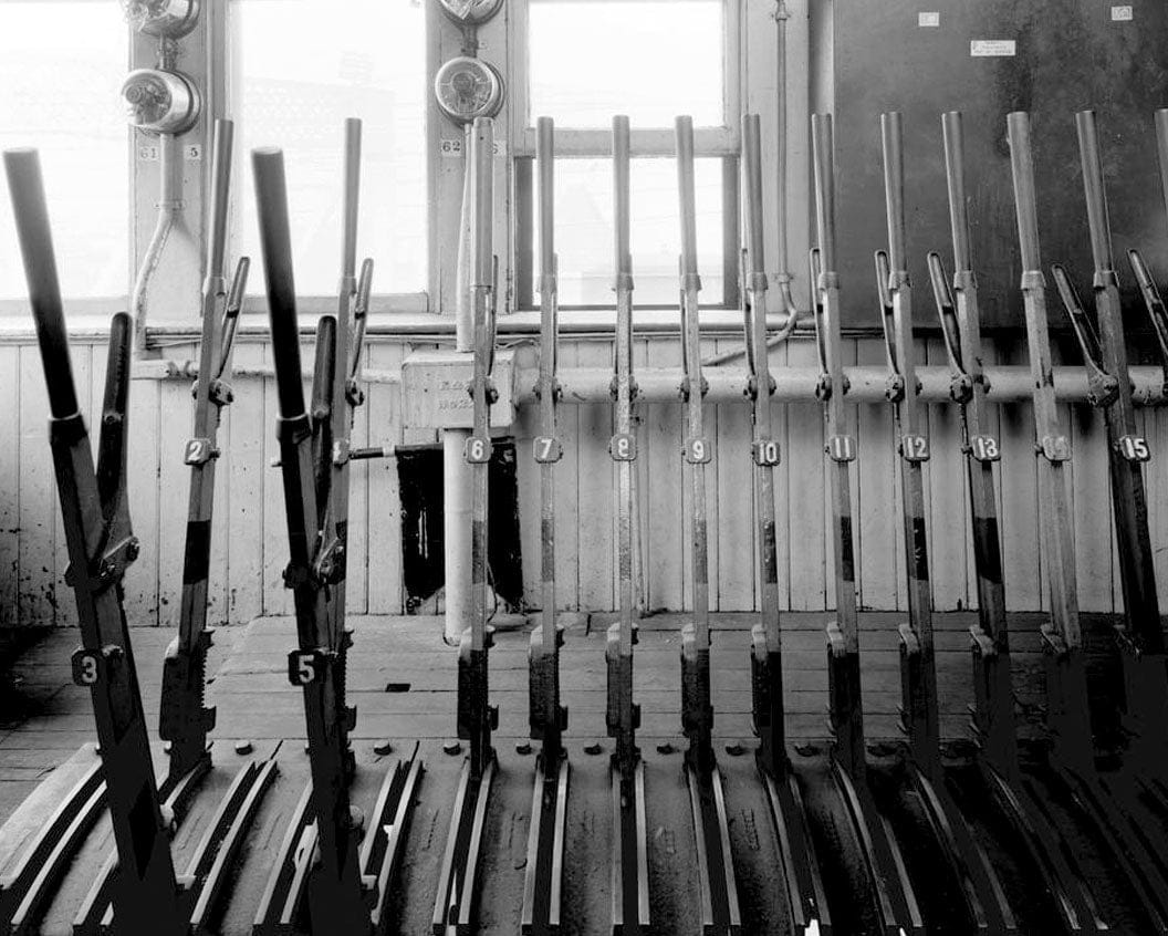 36. INTERIOR VIEW, BERK SWITCH TOWER, SOUTH NORWALK, SHOWING SWITCHING LEVERS FROM OPERATOR'S POSITION - New York, New Haven & Hartford Railroad, Automatic Signalization System, Long Island Sound shoreline between Stamford & New Haven, Stamford, Fairfield County, CT