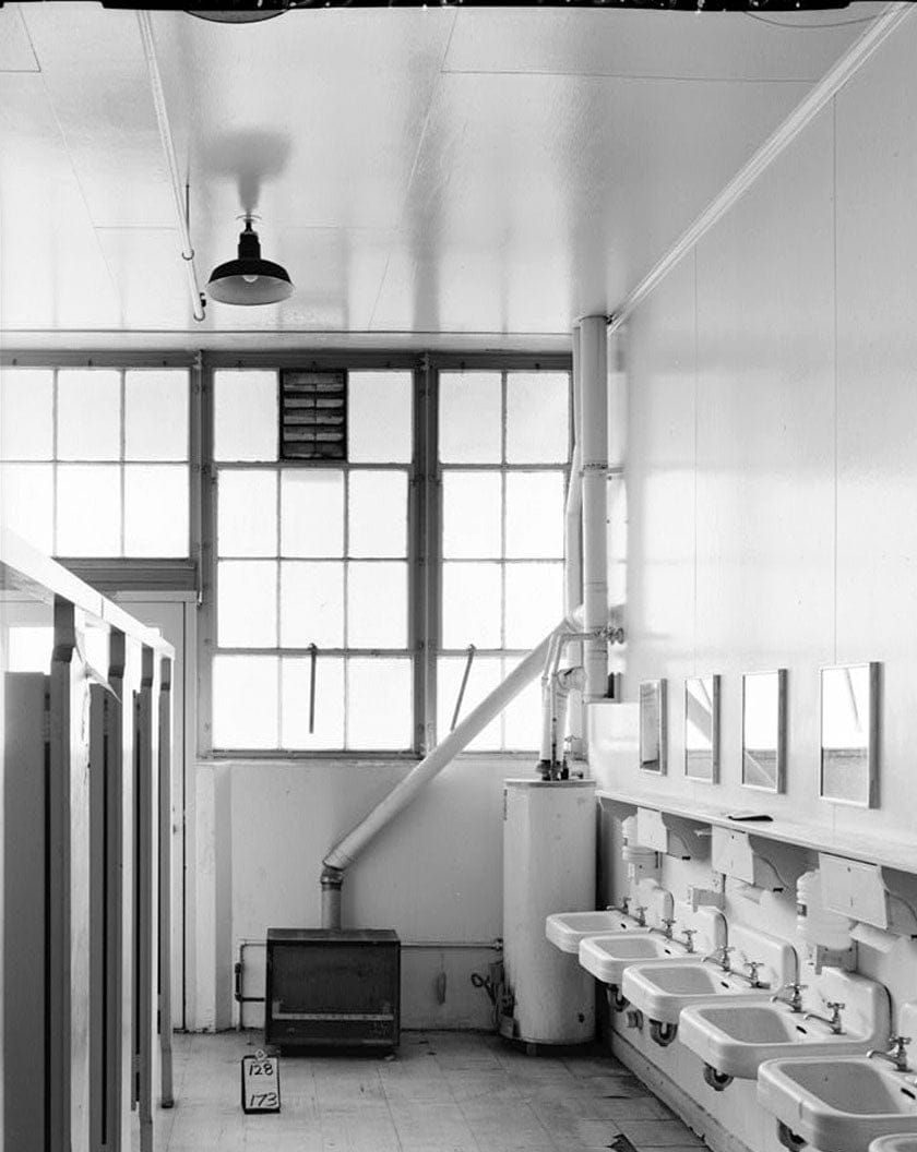 5. BUILDING 413, INTERIOR, MEN'S BATHROOM ON SOUTH SIDE OF BUILDING, FROM ENTRY, LOOKING SOUTH. - Oakland Naval Supply Center, Heavy Materials & Paint-Oil Storehouses, Between Fourth & Sixth streets, between B & D Streets, Oakland, Alameda County, CA