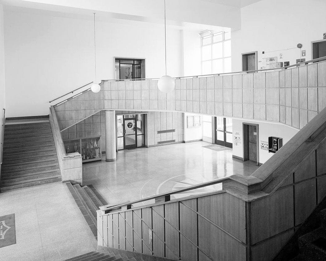 VIEW OF INTERIOR OF MAIN LOBBY, BUILDING 1, FROM INTERMEDIATE LANDING OF STAIRS FACING SOUTHWEST - Roosevelt Base, Administration & Brig Building, Bounded by Nevada & Colorado Streets, Reeves & Richardson Avenues, Long Beach, Los Angeles County, CA