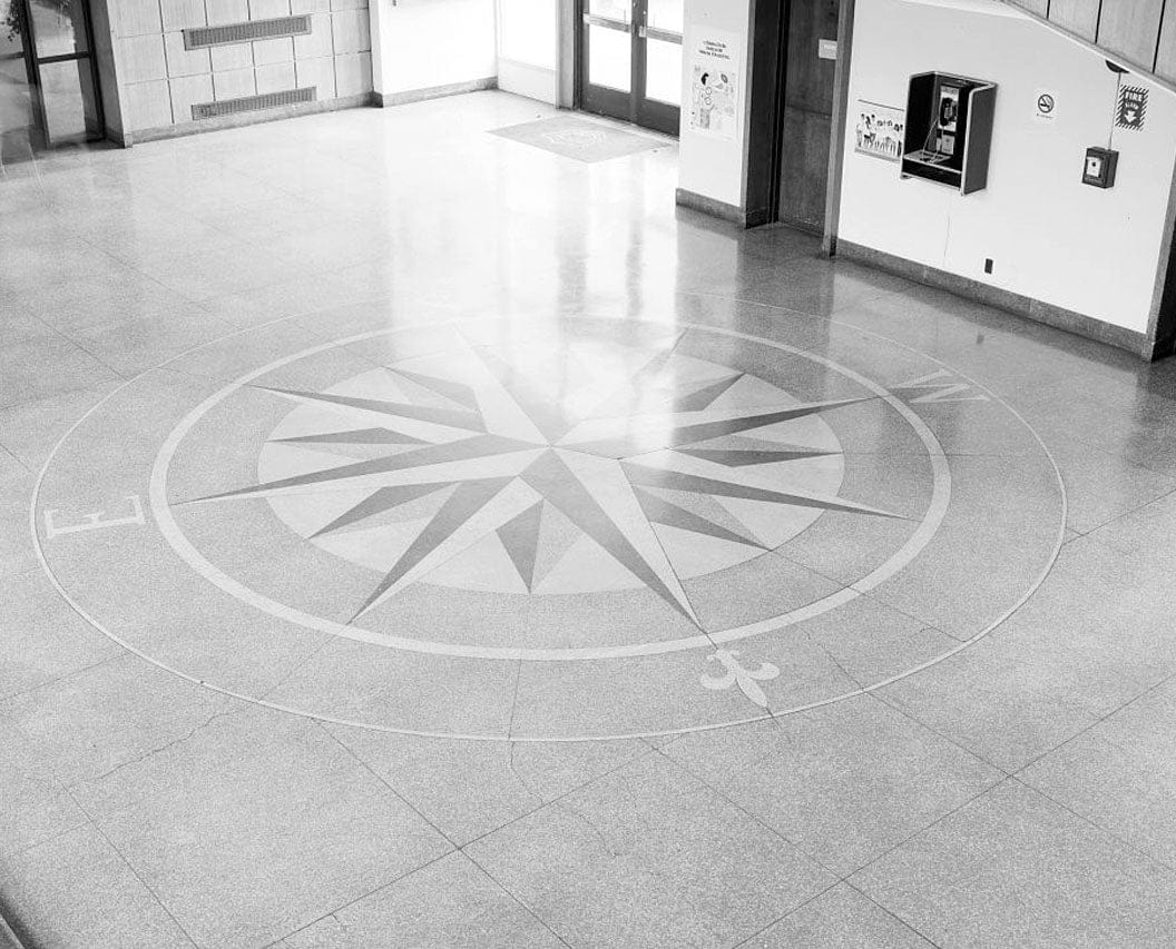 VIEW OF COMPASS ROSE TILE INLAY IN FLOOR OF LOBBY, BUILDING 1, LOOKING SOUTHEAST - Roosevelt Base, Administration & Brig Building, Bounded by Nevada & Colorado Streets, Reeves & Richardson Avenues, Long Beach, Los Angeles County, CA