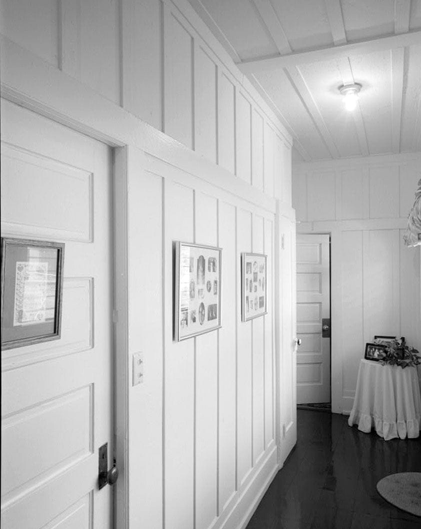 FACILITY 810A, HALLWAY WITH BEDROOM DOOR IN LEFT FOREGROUND AND BATHROOM DOOR AT END, VIEW FACING WEST, NORTHWEST. - Schofield Barracks Military Reservation, Duplex Housing Type with Corner Entries, Between Hamilton & Tidball Streets near Williston Avenue, Wahiawa, Honolulu County, HI