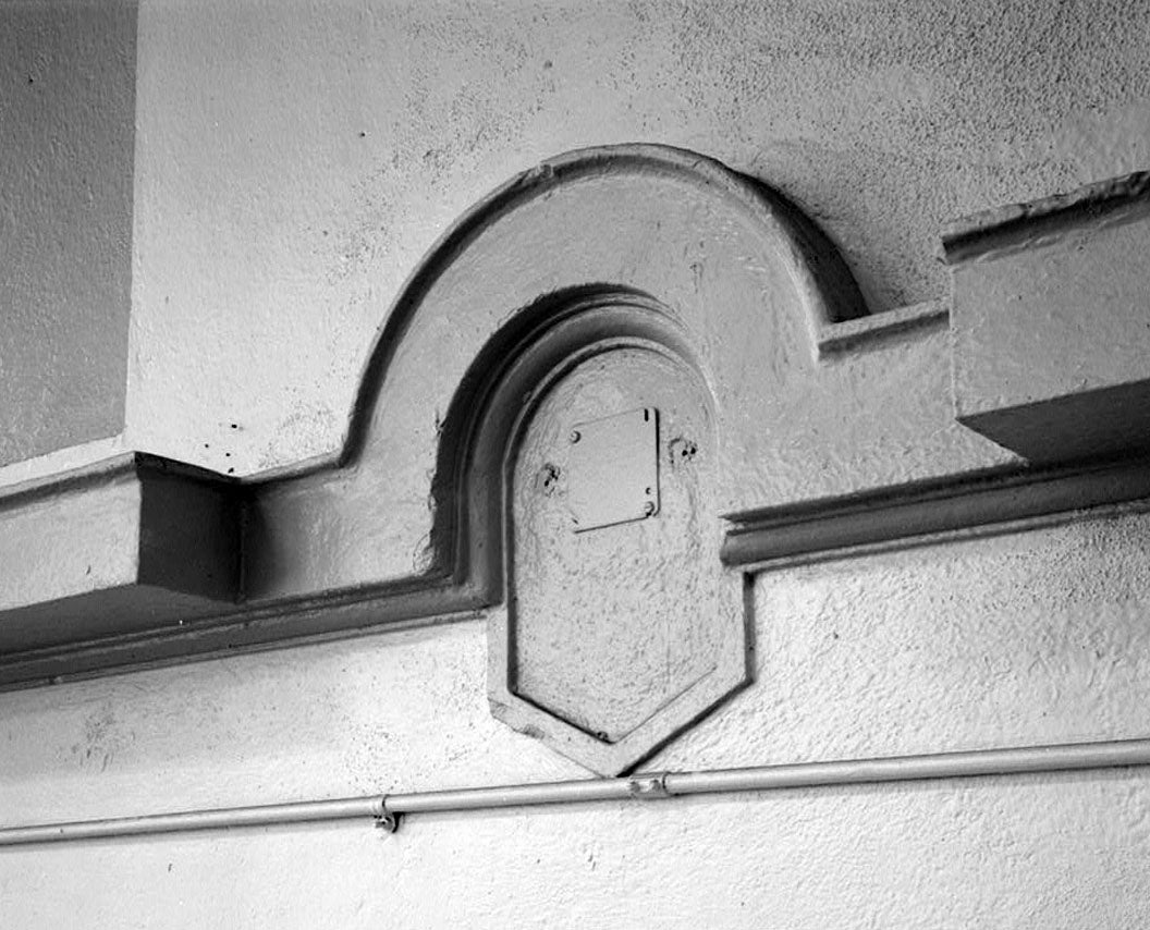 INTERIOR OF THEATER ON THIRD FLOOR, DETAIL OF WALL ORNAMENTATION WHERE SCONCES WERE ORIGINALLY LOCATED, VIEW FACING WEST. - Schofield Barracks Military Reservation, Quadrangle I Administration Building, Williston Avenue between Wright-Smith & Reilly Avenues, Wahiawa, Honolulu County, HI