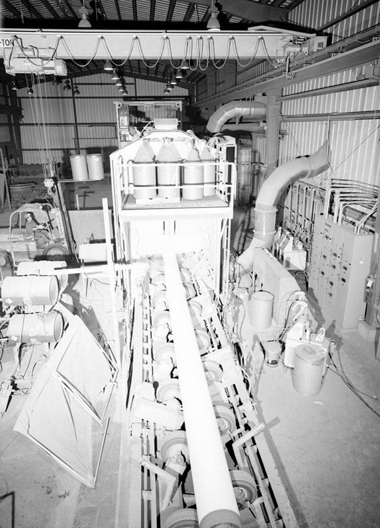INTERIOR VIEW, LOOKING WEST, WITH PIPE BEING SPRAYED WITH ZINC COATING. - United States Pipe & Foundry Company Plant, Coating, Painting, Lining & Packaging Building, 2023 St. Louis Avenue at I-20/59, Bessemer, Jefferson County, AL