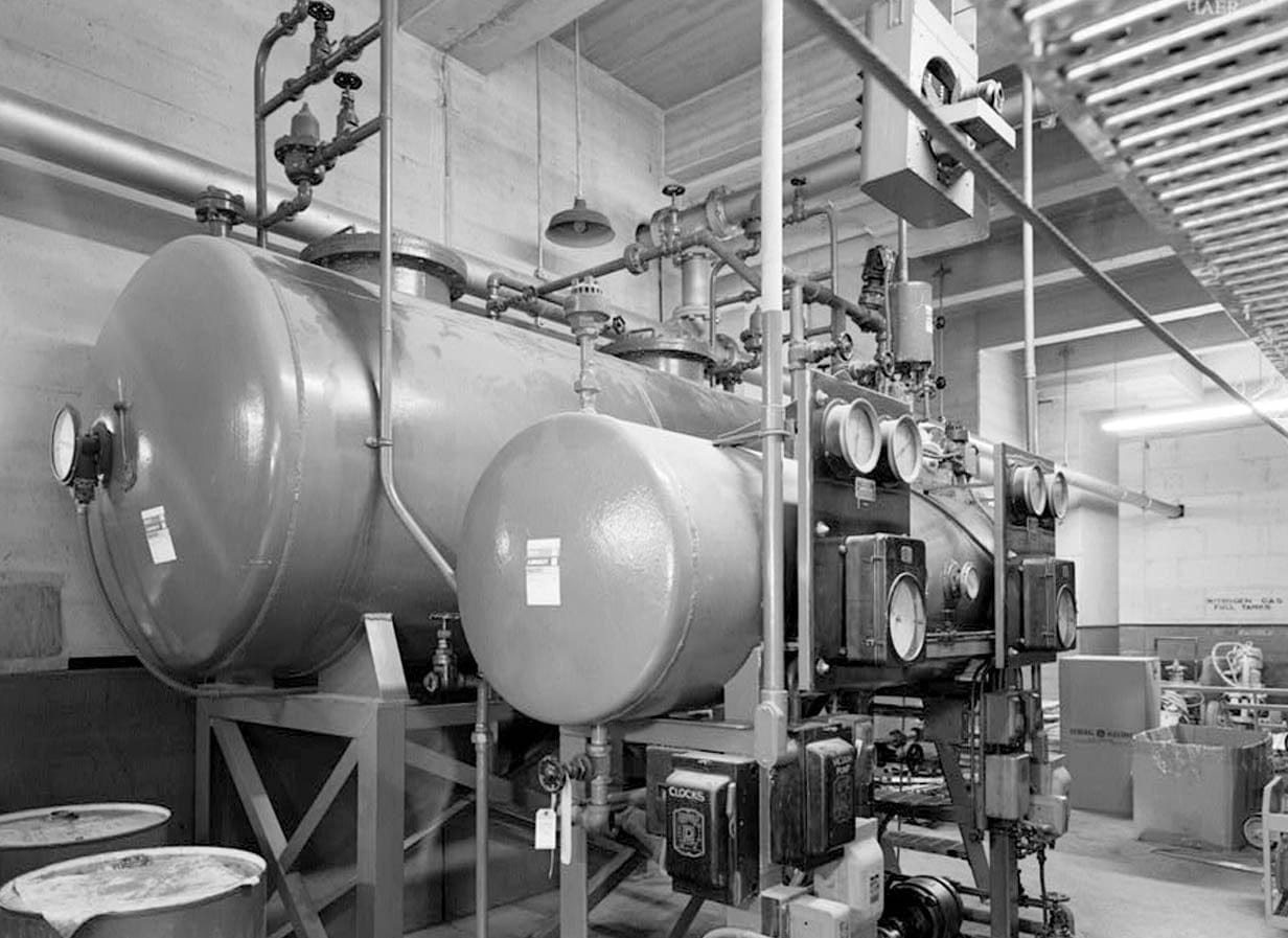 INTERIOR VIEW LOOKING AT THE OILOSTATIC RESERVOIR AND PRESSURIZING TANKS. - Wilson Dam & Hydroelectric Plant, Oilostatic Transmission System, Spanning Tennessee River at Wilson Dam Road (Route 133), Muscle Shoals, Colbert County, AL
