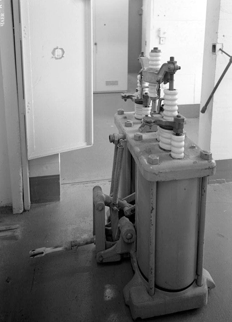 CLOSE-UP VIEW OF THE OIL CIRCUIT BREAKER SWITCH. - Wilson Dam & Hydroelectric Plant, Three Phase Tri Level Circuit Breaker, Spanning Tennessee River at Wilson Dam Road (Route 133), Muscle Shoals, Colbert County, AL