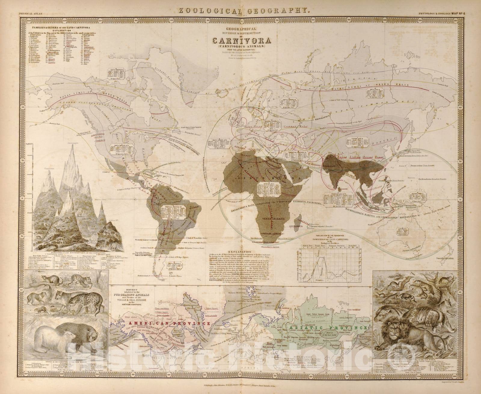 Historic 1848 Map - The Physical Atlas - Zoological Geography of Carnivorous Animals of The World, Sheet 2