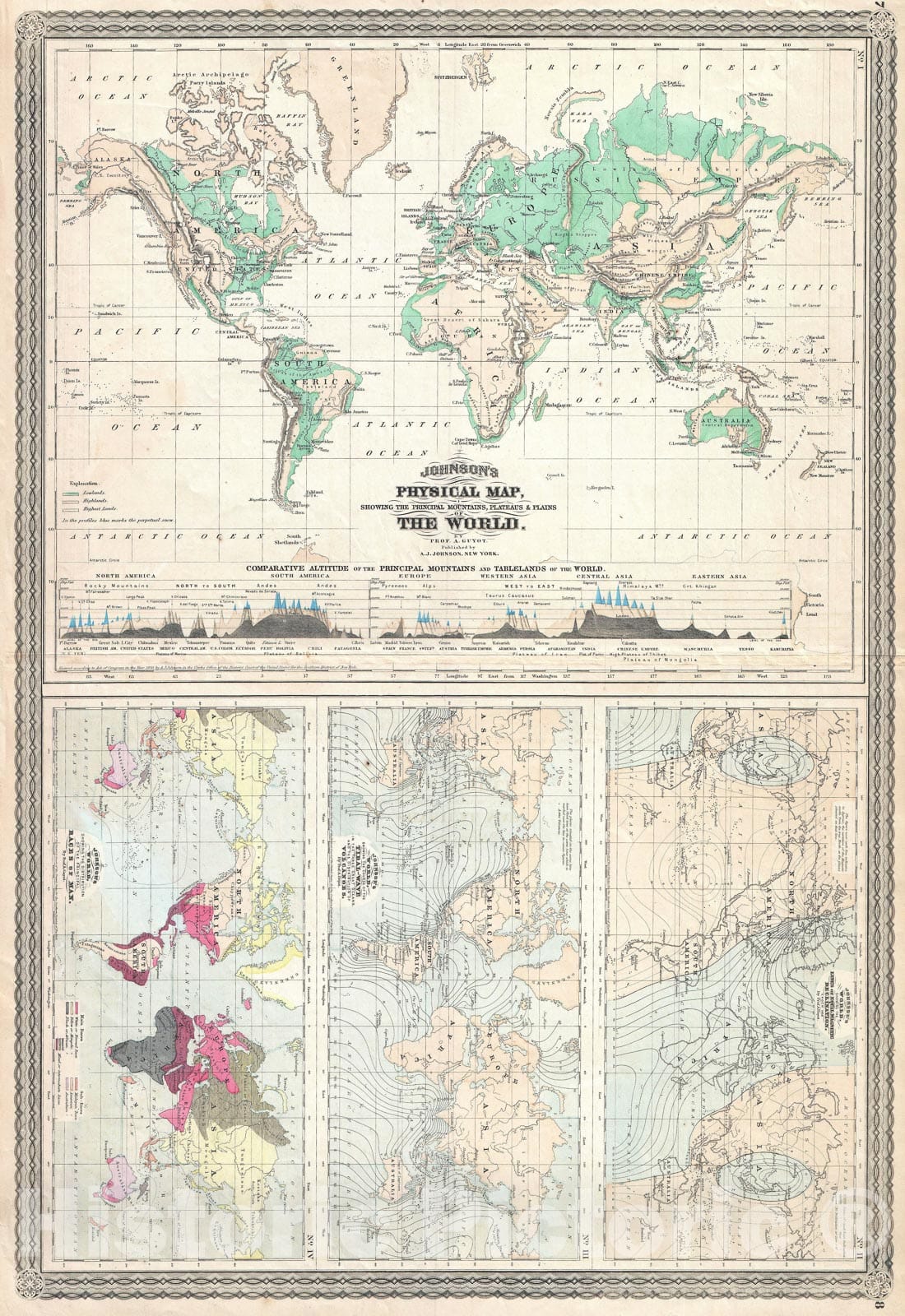 The World w/ Physical Map, Tidal Map, Races and Declination, Johnson Climate, 1870