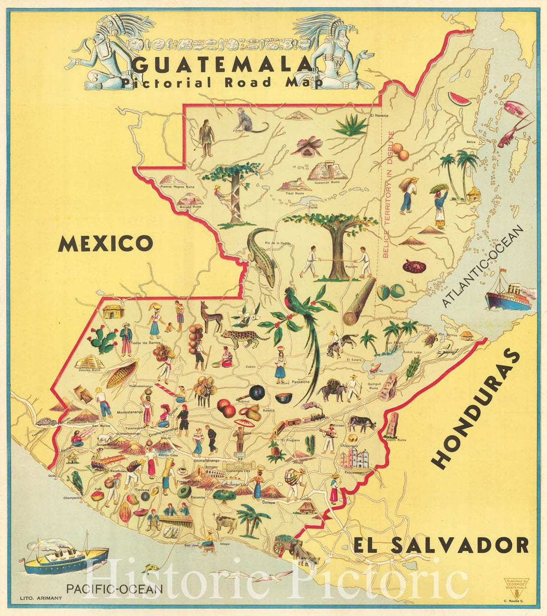 Historic Map : Guatemala Pictorial Road Map, 1945, C Neutze, Vintage Wall Art