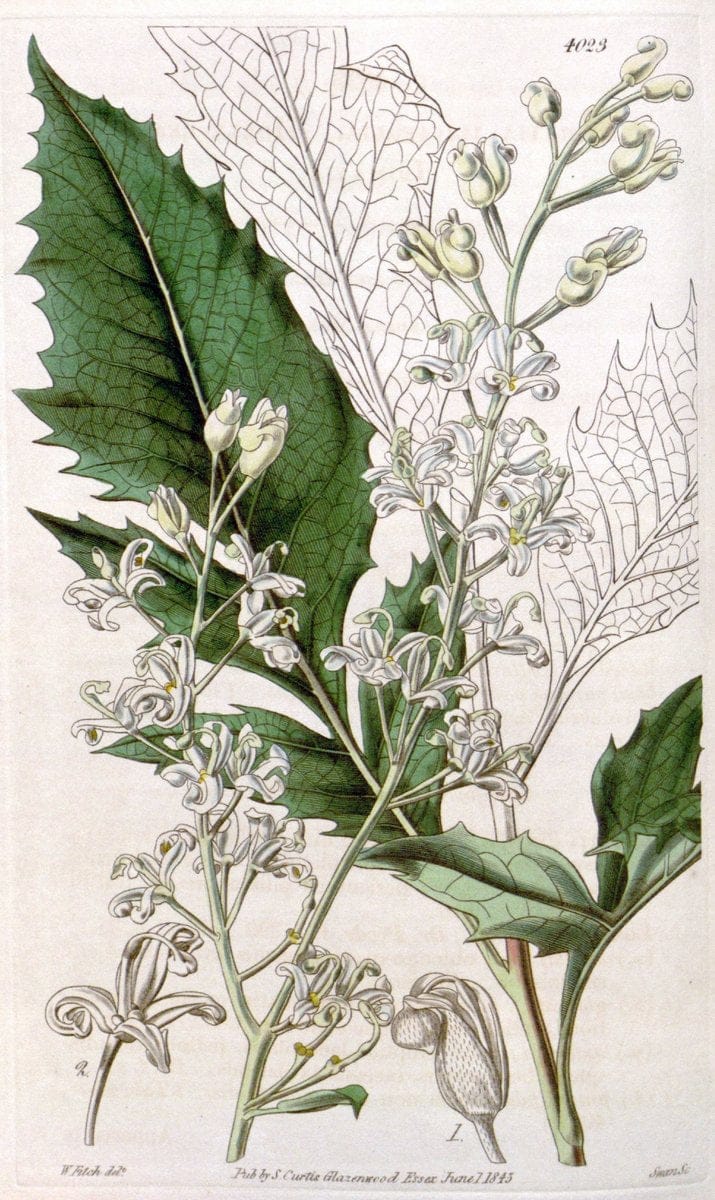 Curtis's botanical magazine. London ; New York [etc.] :Academic Press [etc.].|"Botanical illustration" Botany Periodicals "Pictorial works" "Plants, Ornamental" "Missouri Botanical Garden, Peter H. Raven Library" |taxonomy:binomial=Lomatia ilicifolia | geo:country=Australia