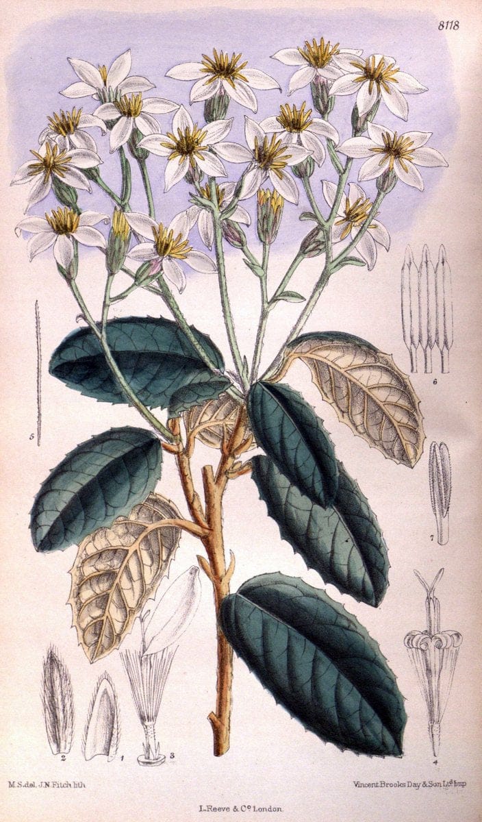 Curtis's botanical magazine. London ;New York [etc.] :Academic Press [etc.].|Botany Periodicals "Pictorial works" "Missouri Botanical Garden, Peter H. Raven Library" |artist:name=Matilda Smith | artist:viaf=48272868 | taxonomy:binomial=Olearia speciosa | taxonomy:common=Netted Daisy-bush | geo:country=Australia
