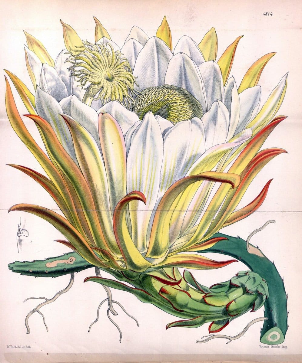 Curtis's botanical magazine. London ;New York [etc.] :Academic Press [etc.].|Botany Periodicals "Pictorial works" "Missouri Botanical Garden, Peter H. Raven Library" |artist:name=Walter Hood Fitch | artist:viaf=12458289 flowers | taxonomy:binomial=Cereus lemairii | taxonomy:common=Lemaire’s Cereus | taxonomy:binomial=Hylocereus lemairei | taxonomy:family=Cactaceae cacti cactus | taxonomy:common=night-blooming cactus | BHLIG HistSciArt