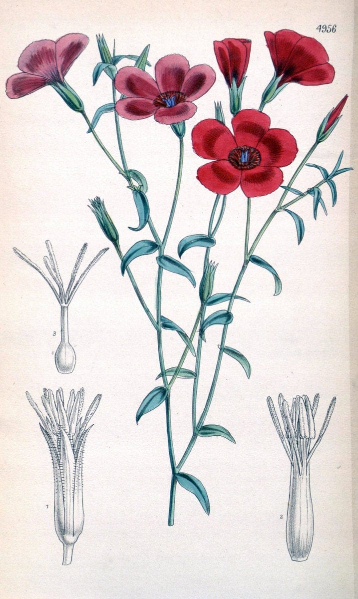 Curtis's botanical magazine. London ;New York [etc.] :Academic Press [etc.].|Botany Periodicals "Pictorial works" "Missouri Botanical Garden, Peter H. Raven Library" |lowers | artist:name=Walter Hood Fitch | artist:viaf=12458289 | taxonomy:binomial=Linum grandiflorum | taxonomy:common=Large-flowered Flax | taxonomy:common=crimson flax | Algeria