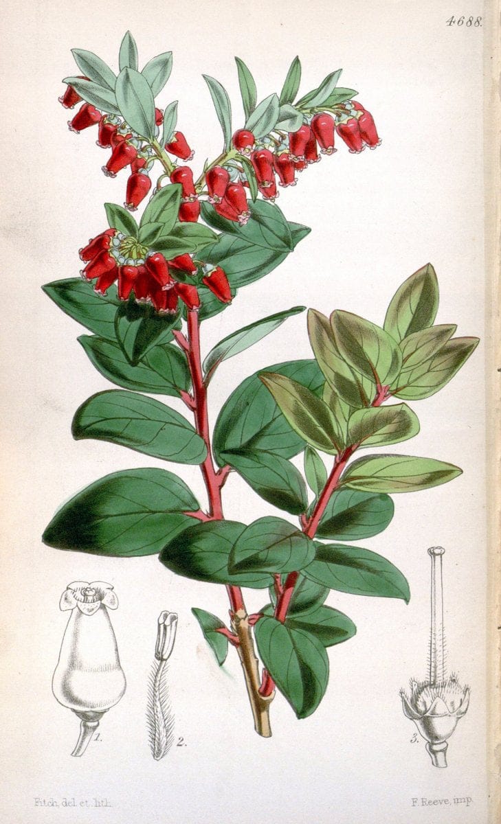 Curtis's botanical magazine. London ; New York [etc.] :Academic Press [etc.].|"Botanical illustration" Botany Periodicals "Pictorial works" "Plants, Ornamental" "Missouri Botanical Garden, Peter H. Raven Library" | | taxonomy:binomial=Vaccinium erythrinum | taxonomy:common=Java Mountain Lingonberry | taxonomy:family=Ericaceae geo:country=Indonesia geo:locality=Java