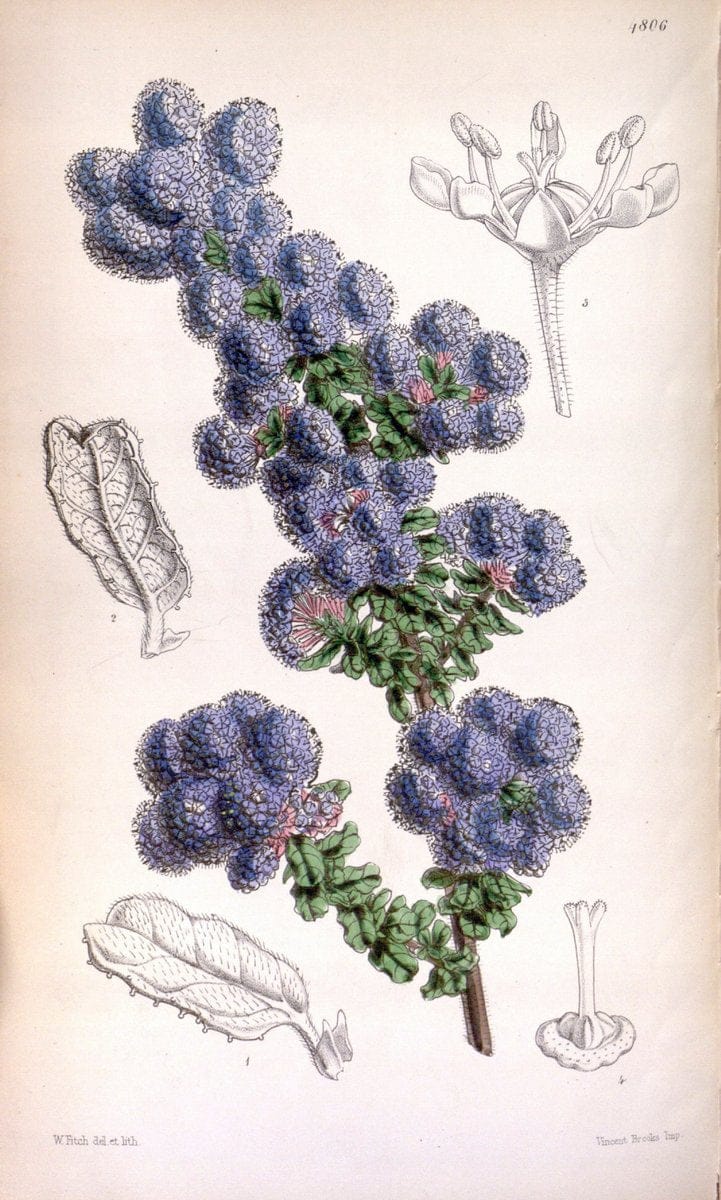 Curtis's botanical magazine. London ;New York [etc.] :Academic Press [etc.].|Botany Periodicals "Pictorial works" "Missouri Botanical Garden, Peter H. Raven Library" |purple flowers | artist:name=Walter Hood Fitch | artist:viaf=12458289 | taxonomy:binomial=Ceanothus floribundus | taxonomy:binomial=Ceanothus dentatus | taxonomy:common=Copious-flowering Ceanothus | Mexico (Baja California) | taxonomy:common=sandscrub ceanothus | HistSciArt