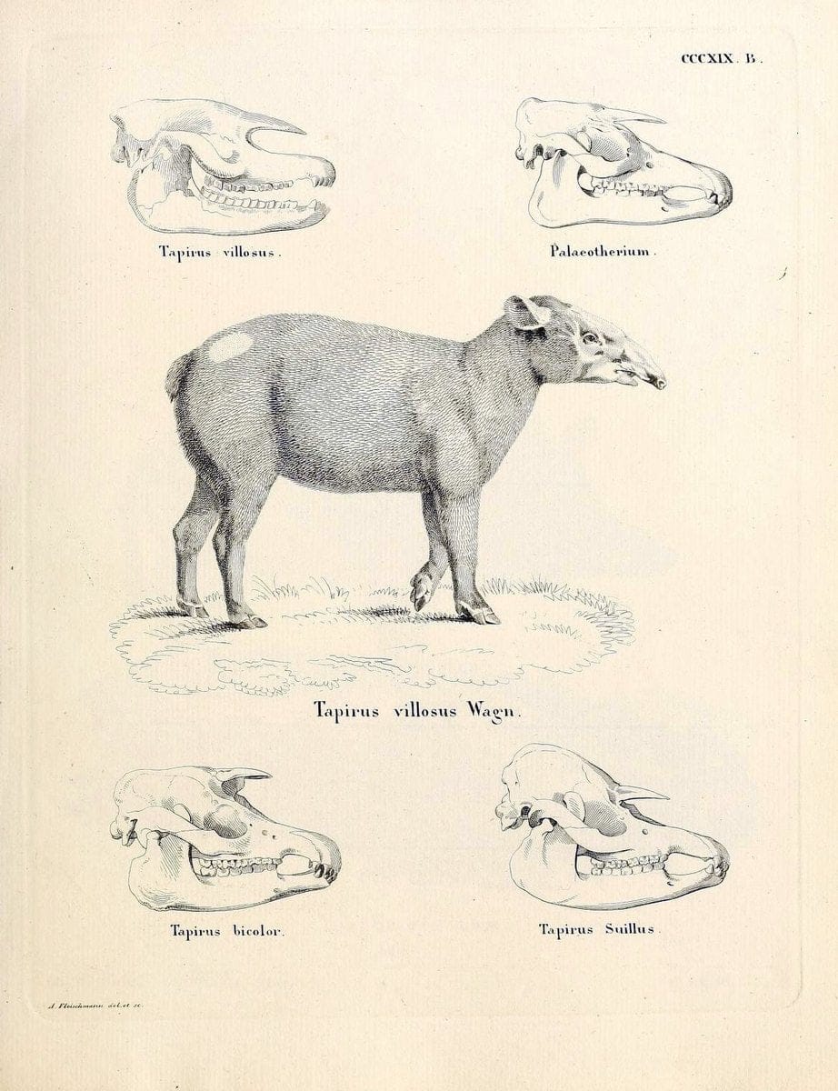 Die Säugthiere in Abbildungen nach der Natur /.Erlangen :Expedition des Schreber'schen säugthier- und des Esper'schen Schmetterlingswerkes [etc.,1774]-1846. |Mammals "Pictorial works" "Harvard University, MCZ, Ernst Mayr Library" |taxonomy:binomial=Tapirus villosus | taxonomy:binomial=Tapirus bicolor | taxonomy:binomial=Tapirus suillus |