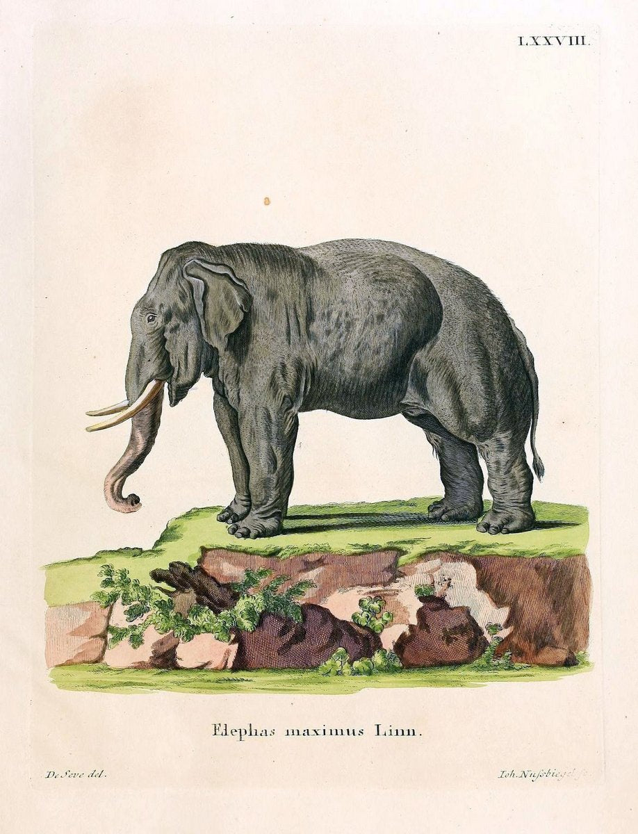 Die Säugthiere in Abbildungen nach der Natur /.Erlangen :Expedition des Schreber'schen säugthier- und des Esper'schen Schmetterlingswerkes [etc.,1774]-1846. |Mammals "Pictorial works" "Harvard University, MCZ, Ernst Mayr Library" |lephant elephant taxonomy:family=Elephantidae | taxonomy:binomial=Elephas maximus |