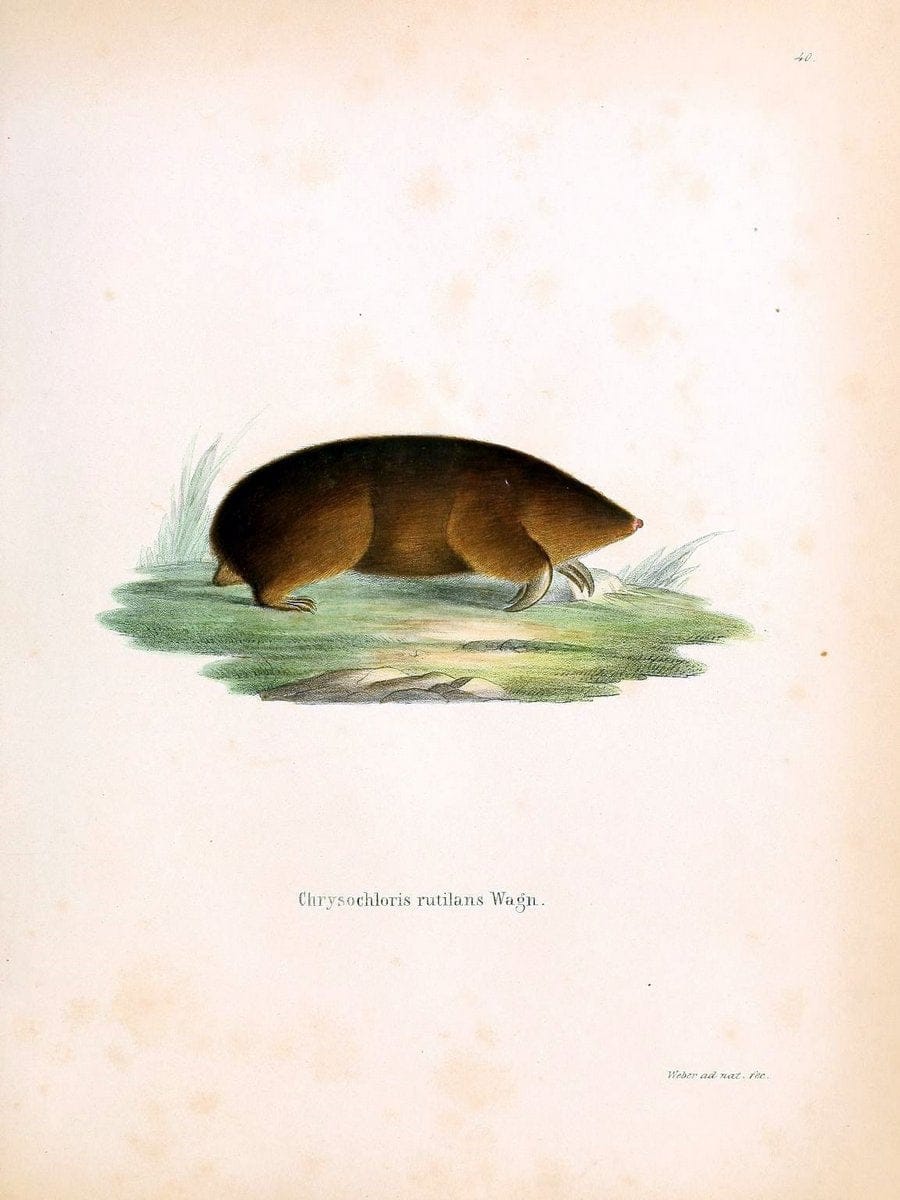 Die Säugthiere in Abbildungen nach der Natur /.Erlangen :Expedition des Schreber'schen säugthier- und des Esper'schen Schmetterlingswerkes [etc.,1774]-1846. |Mammals "Pictorial works" "Harvard University, MCZ, Ernst Mayr Library" |taxonomy:binomial=Chrysochloris rutilans | artist:name=J J Weber |