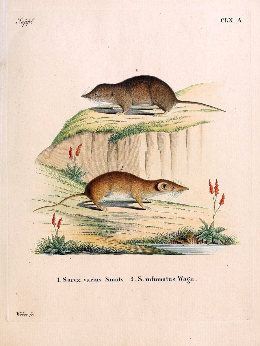 Die Säugthiere in Abbildungen nach der Natur /.Erlangen :Expedition des Schreber'schen säugthier- und des Esper'schen Schmetterlingswerkes [etc.,1774]-1846. |Mammals "Pictorial works" "Harvard University, MCZ, Ernst Mayr Library" |taxonomy:binomial=Myosorex varius | taxonomy:binomial=Crocidura cyanea | artist:name=J J Weber |