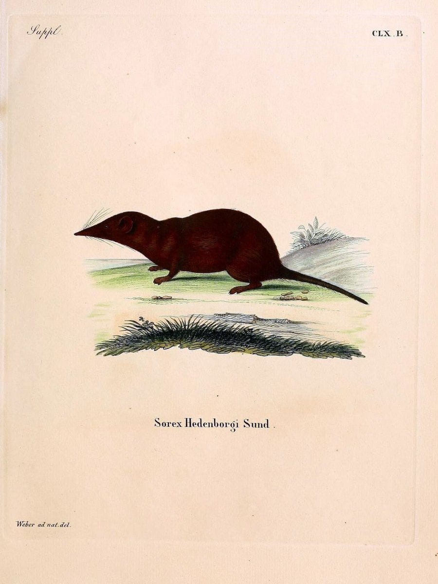 Die Säugthiere in Abbildungen nach der Natur /.Erlangen :Expedition des Schreber'schen säugthier- und des Esper'schen Schmetterlingswerkes [etc.,1774]-1846. |Mammals "Pictorial works" "Harvard University, MCZ, Ernst Mayr Library" |taxonomy:binomial=Sorex hedenborgi | artist:name=J J Weber |