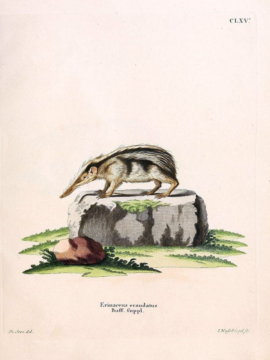 Die Säugthiere in Abbildungen nach der Natur /.Erlangen :Expedition des Schreber'schen säugthier- und des Esper'schen Schmetterlingswerkes [etc.,1774]-1846. |Mammals "Pictorial works" "Harvard University, MCZ, Ernst Mayr Library" |taxonomy:binomial=Erinaceus ecaudatus | artist:name=Jacques de Sève |