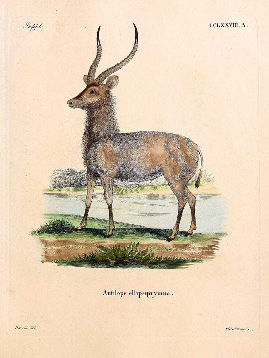 Die Säugthiere in Abbildungen nach der Natur /.Erlangen :Expedition des Schreber'schen säugthier- und des Esper'schen Schmetterlingswerkes [etc.,1774]-1846. |Mammals "Pictorial works" "Harvard University, MCZ, Ernst Mayr Library" |artist:name=William Cornwallis Harris | artist:viaf=62612438 | taxonomy:binomial=Antilope ellipsiprymna | taxonomy:binomial=current: Kobus ellipsiprymnus | Waterbuck